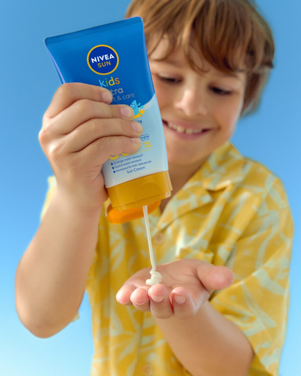 Izberite izdelek, ki ustreza njihovim dejavnostim – vodoodporen za plavanje ali dolgotrajen za igro na prostem. Na primer, Kids Ultra Protect & Play SPF 50+ NIVEA ponuja dodatno odpornost na vodo in pesek ter ohranja zaščito med čofotanjem. Ne glede na formulo po stiku z vodo vedno ponovno nanesite.