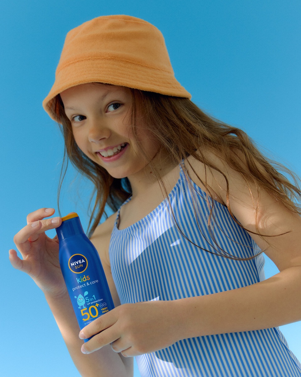 Pri izbiri sončne kreme za otroke upoštevajte, da naj bo enostavna za nanos, nelepljiva in vodoodporna, da bo kos aktivni igri na prostem. Otroška sončna krema Kids Protect & Care SPF 50+ NIVEA ponuja vse to in še več. Obogatena je z vitaminom C, vitaminom E in pantenolom, ki skupaj pomagajo krepiti kožno pregrado ter hkrati varujejo otrokovo kožo pred škodljivimi UV-žarki.