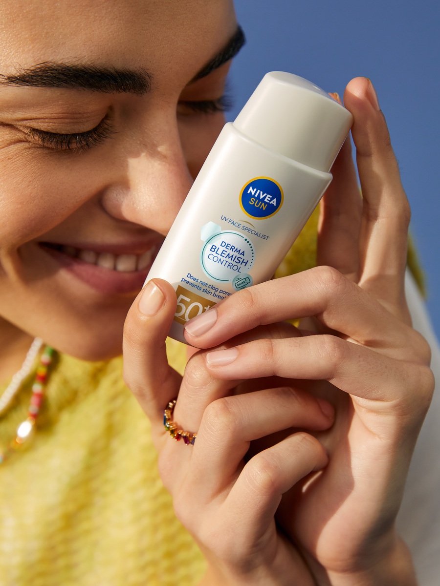 Izdelki za zaščito pred soncem ščitijo kožo pred UV-žarki, ki lahko poslabšajo sledi mozoljev in vnetje. Izberite lahek, nemasten izdelek, na primer UV Face Specialist Derma Skin Clear SPF50+ NIVEA Sun. Njegova formula, razvita za normalno, mastno in kožo, nagnjeno k nepravilnostim, je obogatena s kompleksom proti nepravilnostim NIVEA in niacinamidom. Zaradi teh sestavin, skupaj z UVA/UVB filtri in drugimi sestavinami v formuli, pomaga zaščititi kožo in preprečevati nepravilnosti, saj absorbira odvečno olje s površine kože ter pusti 8-urni* mat učinek.