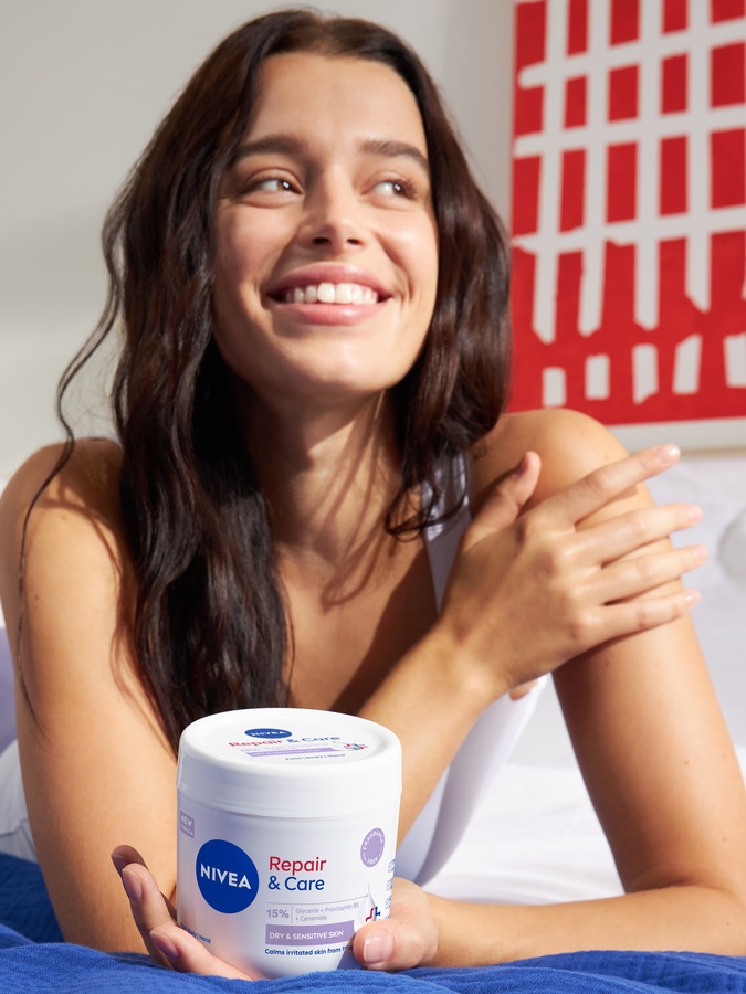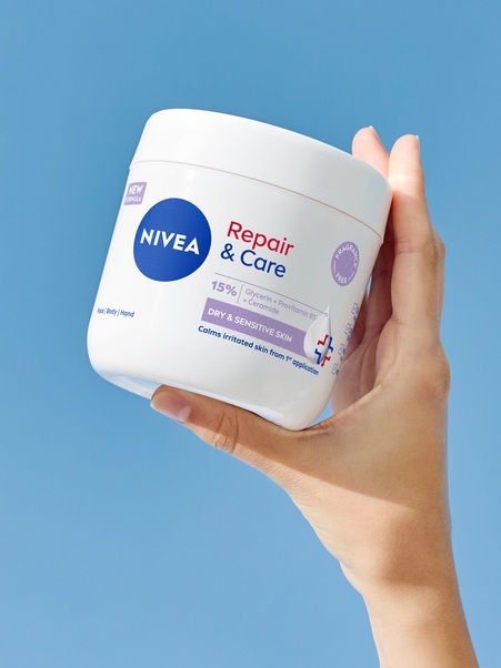Odkrijte kremo za telo brez dišav Repair & Care NIVEA, ki pomaga ublažiti 5 znakov suhe in občutljive kože: suhost, srbenje, rdečico, občutek zategovanja in draženje. S Glicerinom, Provitaminom B5 in ceramidi njena hipoalergena, nemastna formula pomiri občutek draženja že po prvem nanosu in krepi Zaščitna Plast Kože.