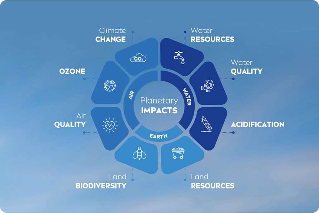 Različni planetarni vplivi – kot so podnebje, voda in kopenska biodiverziteta (npr. krčenje gozdov) – se izračunajo za vsako fazo življenjske dobe izdelka in nato združijo. Ta pristop je med znanstveniki najpogosteje uporabljen za merjenje okoljskega vpliva izdelka.