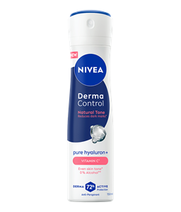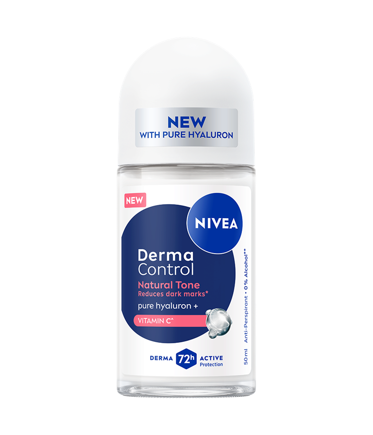 Antiperspirant NIVEA Derma Control Natural Tone roll-on s čistim hialuronom in vitaminom C nudi 72 ur zanesljive zaščite pred potenjem in neprijetnimi vonji. Ob tem zmanjša pojav temnih madežev na koži po britju.