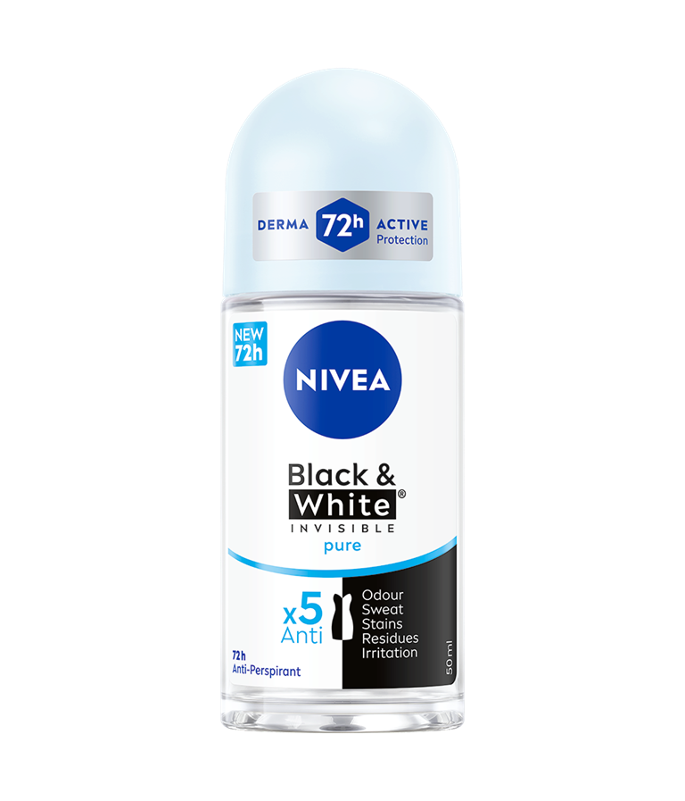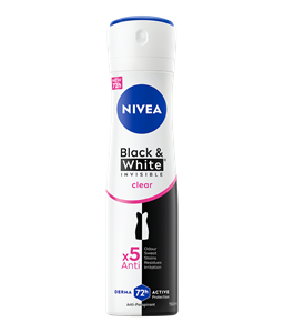 Linija izdelkov NIVEA Black & White Invisible zagotavlja zaščito pred belimi madeži na temnih oblačilih in rumenimi madeži na svetlih oblačilih zahvaljujoč svoji patentirani tehnologiji. Zanesljiva 72-urna zaščita pred potenjem in neprijetnim vonjem, ki neguje vašo kožo.