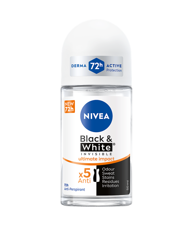 Linija izdelkov NIVEA Black & White Invisible zagotavlja zaščito pred belimi madeži na temnih oblačilih in rumenimi madeži na svetlih oblačilih zahvaljujoč svoji patentirani tehnologiji. Zanesljiva 72-urna zaščita pred potenjem in neprijetnim vonjem, ki neguje vašo kožo.
