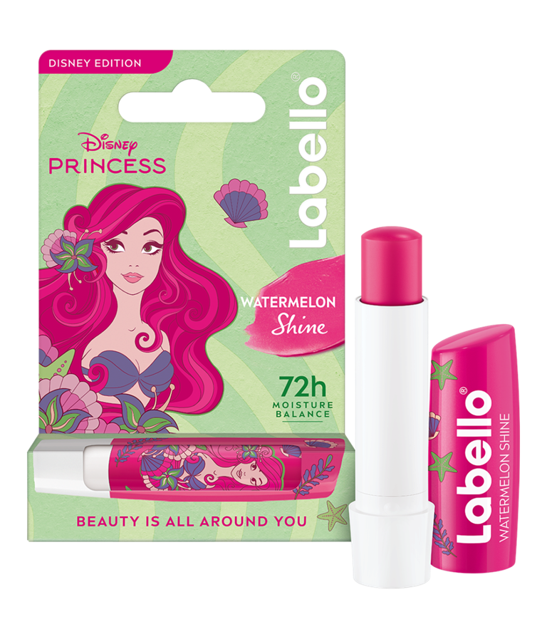 Balzam za ustnice Labello Disney Princess v omejeni izdaji v prikupni embalaži s princeso Ariel globinsko neguje ustnice in razvaja čute z aromo sočne lubenice ter zagotavlja do 72 ur vlaženja. Formula s ceramidi in kolagenskim ojačevalcem krepi naravno zaščitno bariero kože.