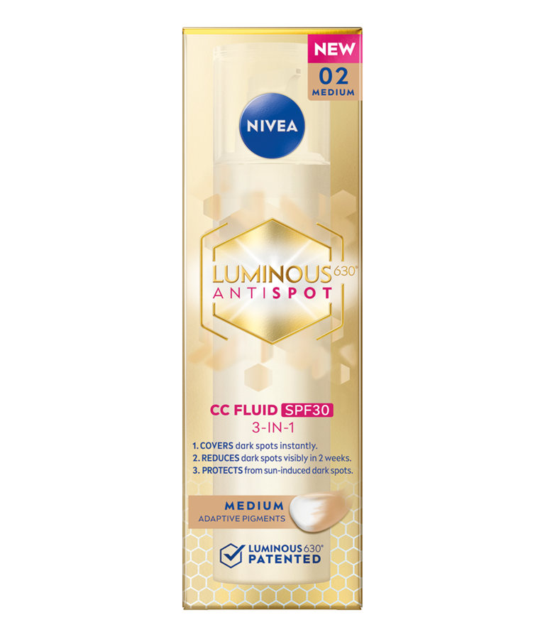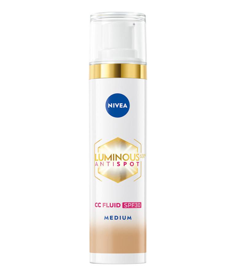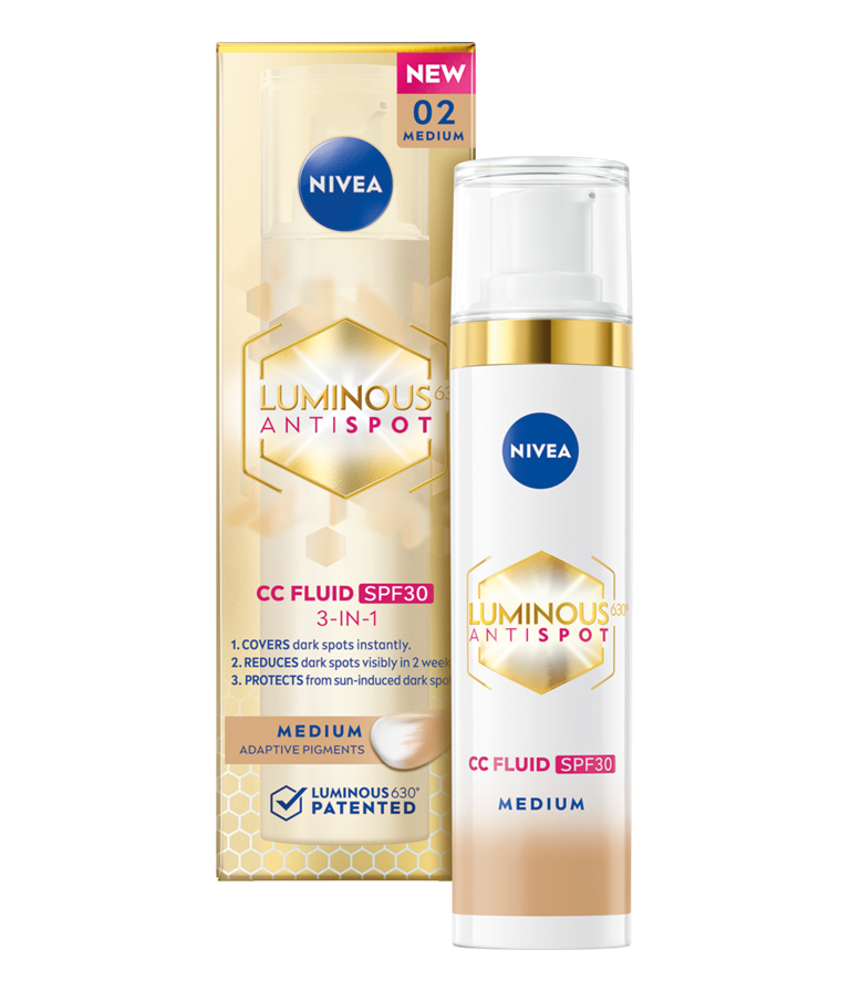 CC fluid Luminous630 3-v-1 z ZF 30 prekriva in zmanjšuje temne madeže ter preprečuje nastanek novih - za vidne rezultate v 2 tednih*. Formula s pigmenti za prilagajanje tenu kože poskrbi za videz enakomerne, svetlejše in sijoče kože.