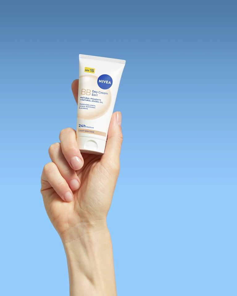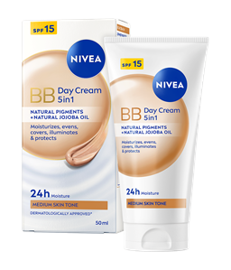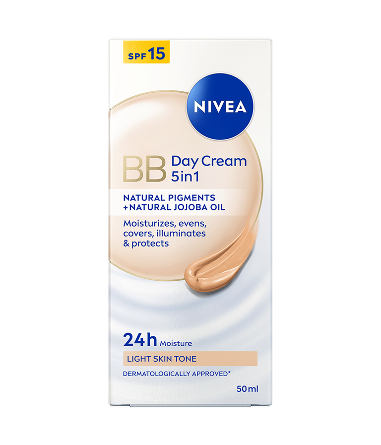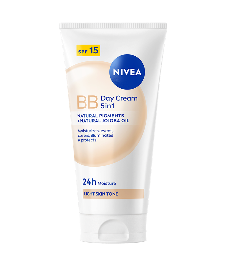 Dnevna BB krema NIVEA 5v1 je popolna izbira za vašo kožo. Lahka formula zagotavlja 24-urno vlaženje ter naravno poenoten, sijoč ten. Prekriva nepravilnosti, kot so mozoljčki, znaki utrujenosti in drobne linije, hkrati pa ščiti kožo pred škodljivimi vplivi sončne svetlobe zahvaljujoč ZF 15.