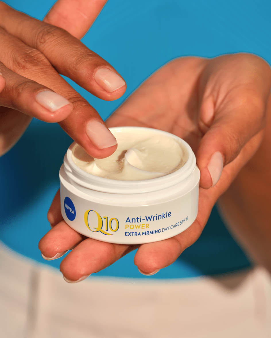 Dnevna krema NIVEA Q10 Energy proti gubam z ZF 15 je obogatena s koencimom Q10, vitaminom C in GLYCOSTOP® za utrujeno kožo brez sijaja.