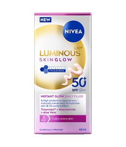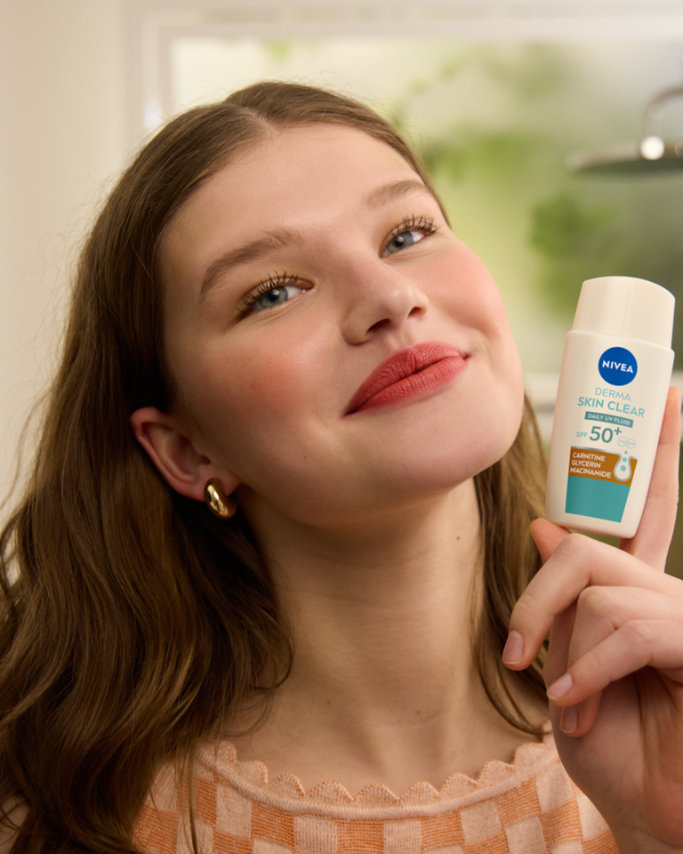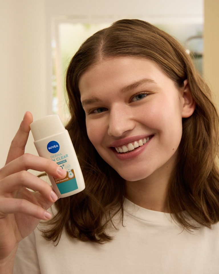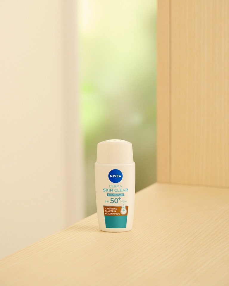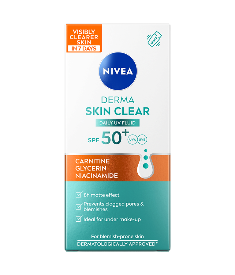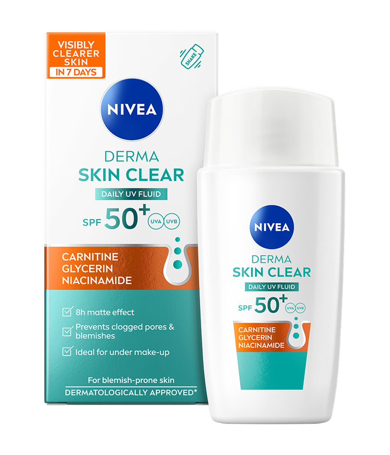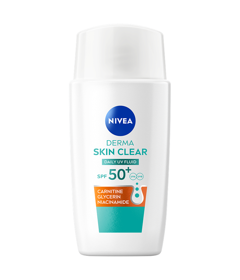 Dnevni UV fluid NIVEA Derma Skin Clear ZF 50+ s karnitinom, glicerinom in niacinamidom je posebej zasnovan za kožo, nagnjeno k nepravilnostim. Ponuja 8-urni mat učinek ter preprečuje mašenje por in nastanek nepravilnosti. Idealen je kot podlaga za ličila.