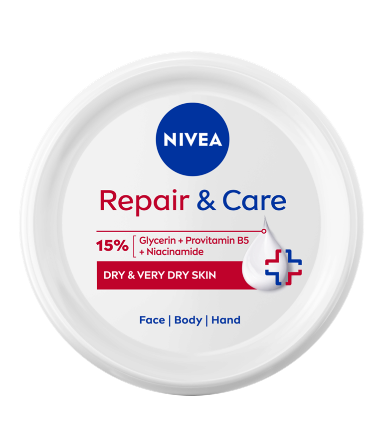 Univerzalna nega NIVEA Repair & Care nudi takojšnje olajšanje za suho kožo s 72-urnim učinkom vlaženja. Formula s 15 % glicerina, provitaminom B5 in niacinamidom krepi kožno bariero. Je hipoalergena, nemastna in se hitro vpija, zato je primerna tudi za otroke, starejše od 3 let. Za dolgotrajen občutek udobja!