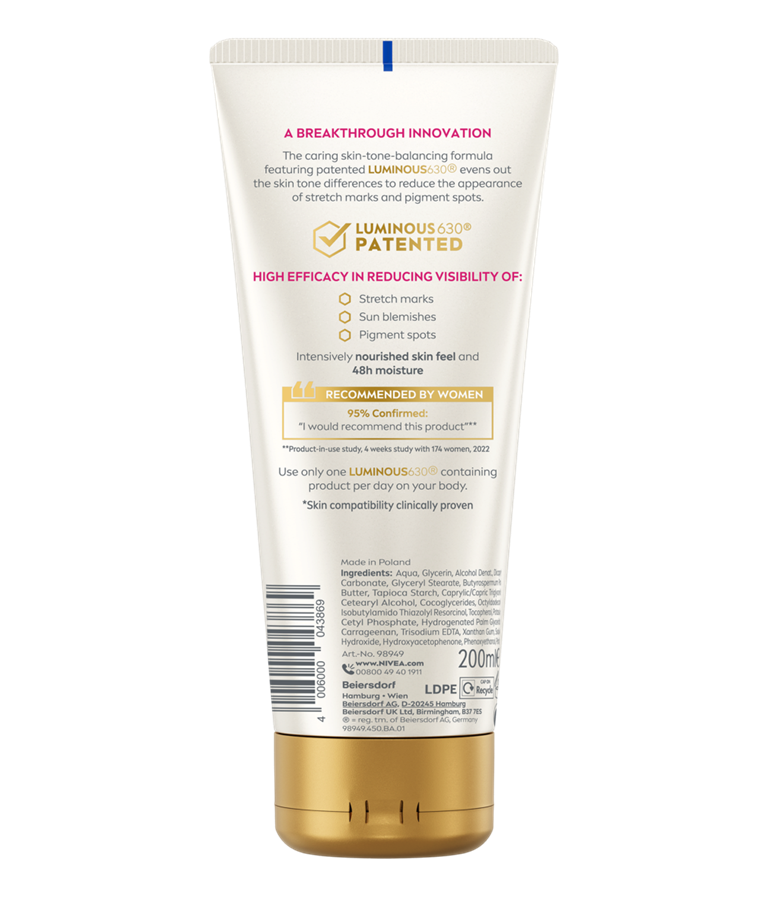 Odkrijte negovalno formulo za uravnavanje tena kože s patentirano sestavino Luminous630®, ki izenači razlike v tenu kože ter zmanjša intenzivnost strij in pigmentnih madežev v 4 tednih. Uživajte v občutku intenzivno nahranjene kože in 48-urno navlažnosti.