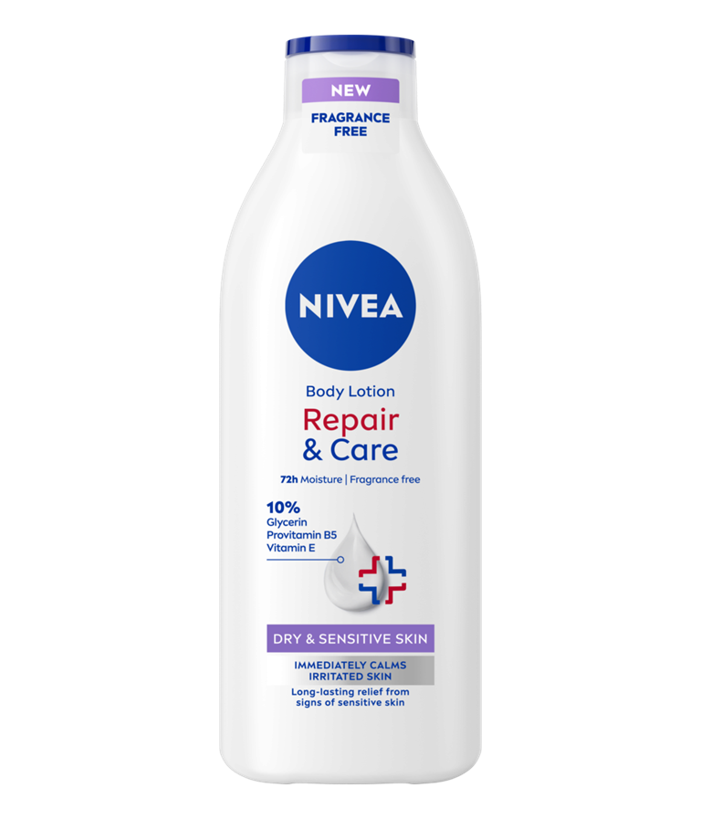 Losjon za telo NIVEA Repair & Care Fragnance Free takoj pomiri razdraženo kožo. Formula brez dišav z 10 % glicerinskim kompleksom + provitaminom B5 + vitaminom E zagotavlja do 72 ur globinskega vlaženja. Popolna izbira za nego suhe in občutljive kože.