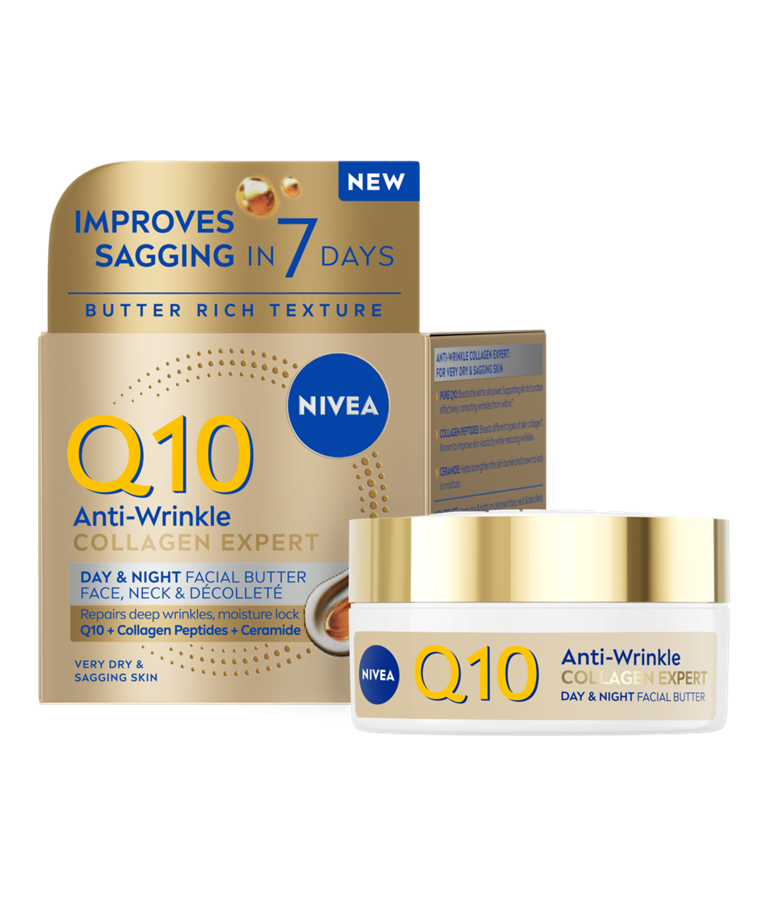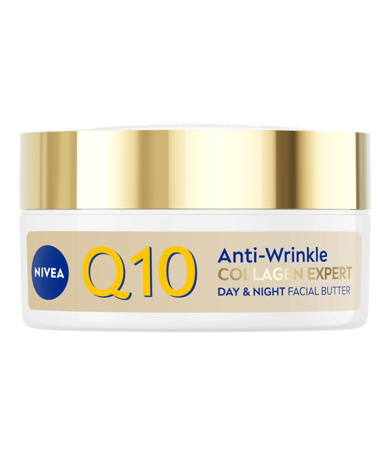 Maslo za obraz NIVEA Q10 Anti-Wrinkle Collagen Expert učvrsti in poudari obrazne konture za bolj gladek ten v 2 tednih.** Naša bogata, maslena formula s čistim Q10, kolagenskimi peptidi in ceramidom se nežno stopi na koži ter zagotavlja globinsko kar 72-urno zadrževanje vlage.
