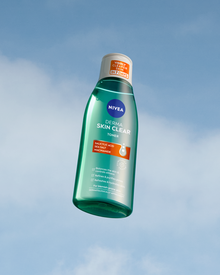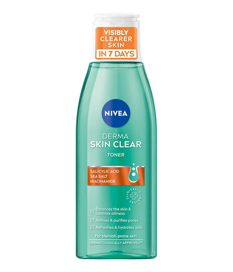 Tonik za obraz NIVEA Derma Skin Clear obnavlja ravnovesje kože, nagnjene k nepravilnostim, jo vlaži in opazno izboljša njen videz že v 7 dneh. Formula s salicilno kislino, morsko soljo in niacinamidom za kožo nagnjeno k nepravilnostim.