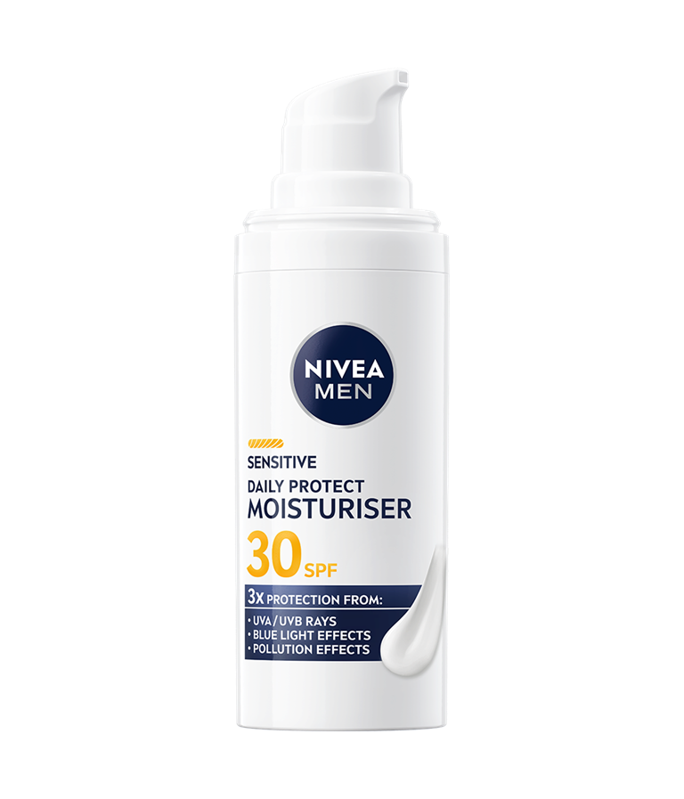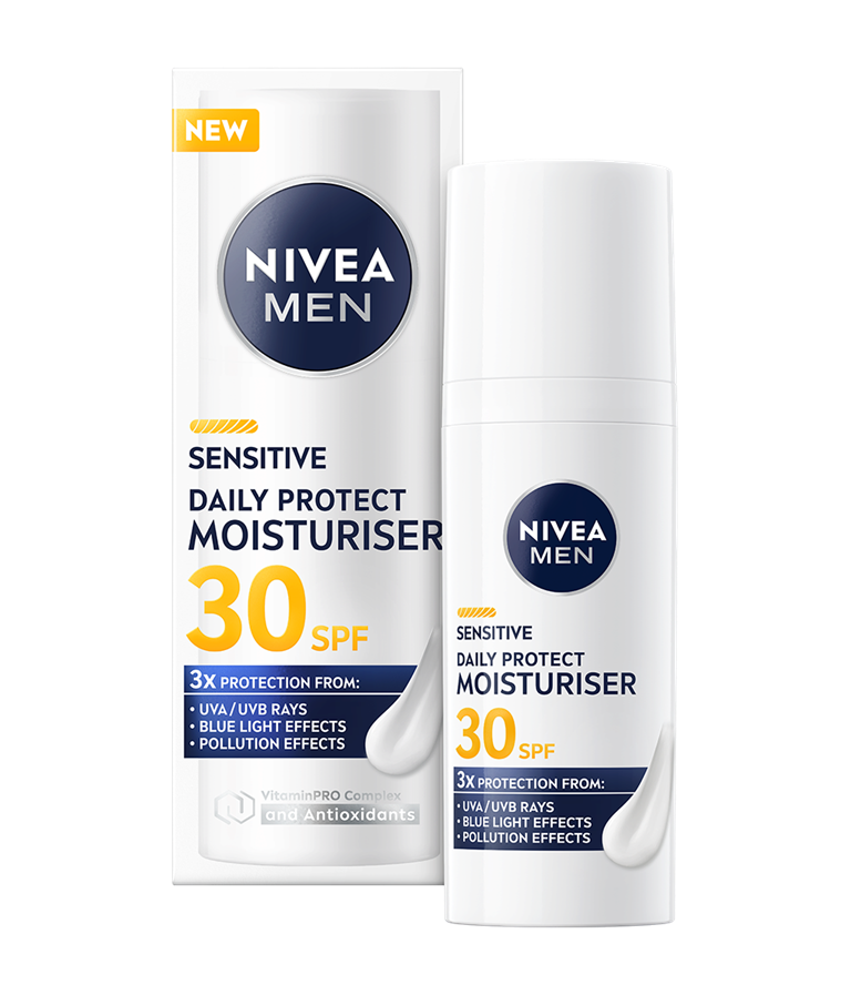 Vlažilna krema NIVEA MEN Sensitive Daily Protect ščiti občutljivo moško kožo z ZF 30, kompleksom VitaminPRO in antioksidanti. Lahka, nemastnaformula brez alkohola* zagotavlja 3-kratno zaščito pred UVA-/UVB-žarki, modro svetlobo in onesnaženjem za zdravo in navlaženo kožo ves dan.